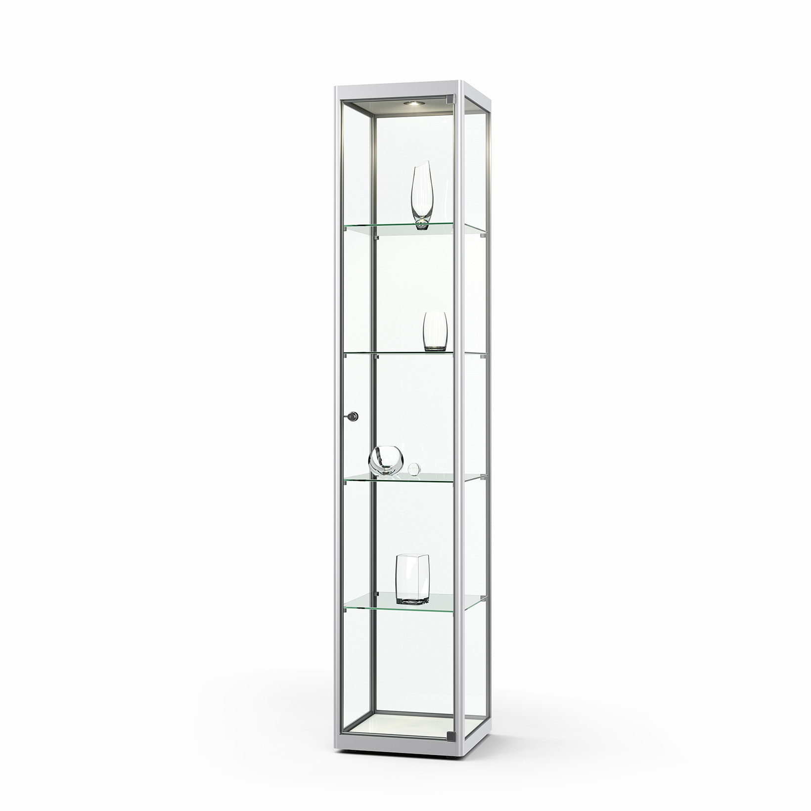 Glasvitrine Vertum - die variable Standvitrine - optional mit Brandschutz Profil-Ansicht von 32 mm - inkl. vier stufenlos verstellbare Glasböden für schwere Exponate – Belastung bis 20kg pro Boden - Optional RAL-Farbe nach WunschGrößen B/H/T1020 × 2000 × 520 mm1220 × 2000 × 520 mm1520 × 2000 × 520 mm2020 × 2000 × 520 mm – mit Glasbodenteilung Öffnung - Rollengelagerte GlasschiebetürenVerglasung - Einscheiben-Sicherheitsglas / ESGOberfläche - Eloxierung in matt-silber (E6/EV1) optional RAL-Farbe nach WunschBeleuchtung - ohne Beleuchtung optional mit LED-Strahlern, in Deckenbereich integriertSchließung - Sicherheitsschloss mit 2 SchlüsselnBrandschutz - optional mit Metallblechfüllungen statt Schichtstoffplatten im Deckel und BodenSie benötigen ein Sondermaß? Kein Problem! Wir fertigen Ihre Vitrine in Sonderanfertigung! Sprechen Sie uns an.