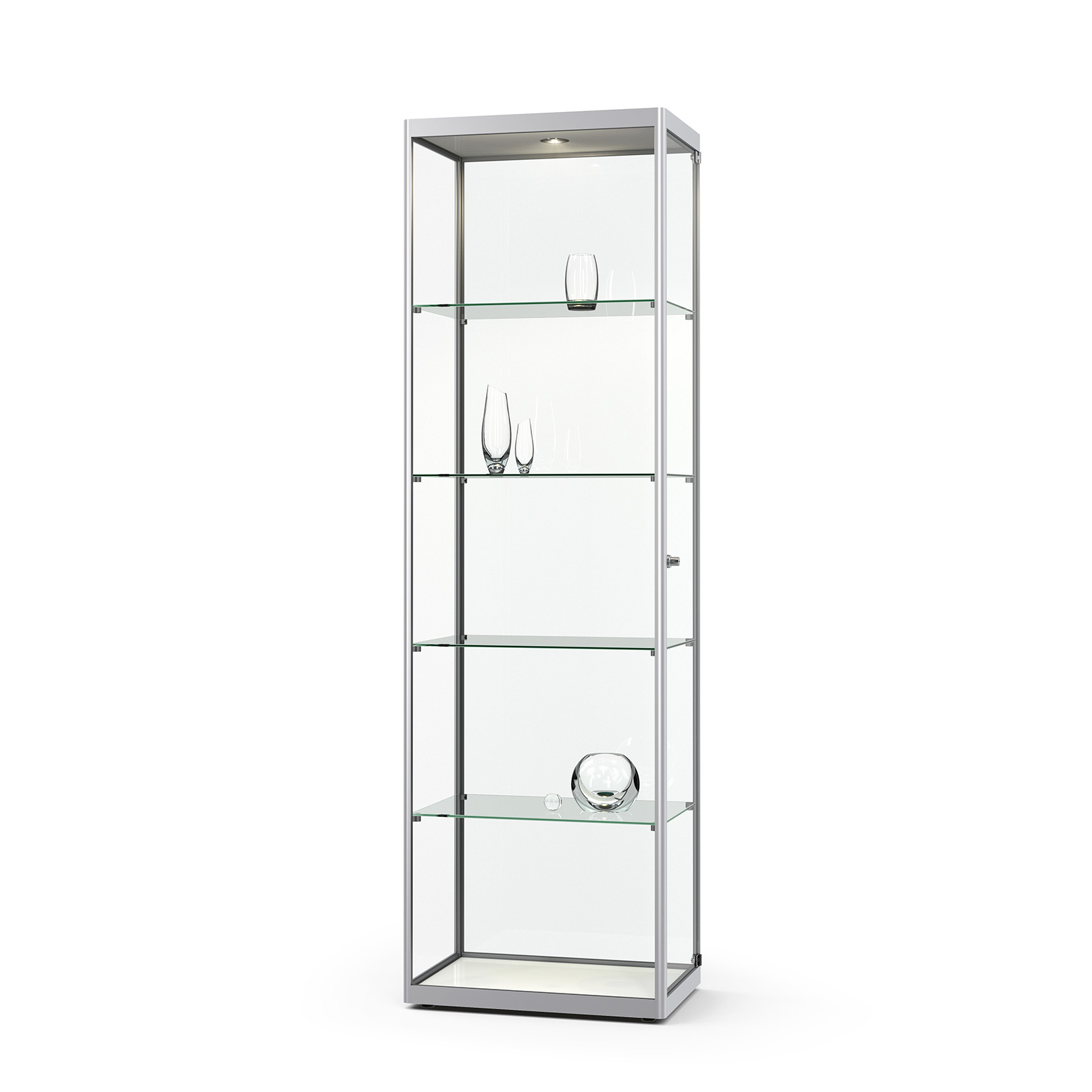 Säulenvitrine Ganzglas mit Deckel - Design-Vitrine für Museen, Ausstellungen oder das exklusive Büro Rahmenlose Ganzglas-Vitrine mit ESG-SicherheitsglasInkl. 3 Glasfachböden, an senkrechten Edelstahl-Stangen stufenlos höhenverstellbarOptionale Beleuchtung mit LED-Strahlern in der Vitrine Größen B/H/T500 × 1900 × 500 mm600 × 1900 × 600 mmSonderanfertigung auf Anfrage Oberfläche - Standard: Sockel/Deckel wahlweise in schwarz, weiß oder hellgrauOptional (gegen Aufpreis): Lackierung in RAL-Farbton nach WahlBeleuchtung - Ohne Beleuchtung – Beleuchtung mit 1 LED-Strahlern, in Deckenbereich integriert - Optional Set mit 4 oder 8 LED-Strahlern in Niedervolt-Technik, anschlussfertig inkl. Trafo an senkrechter Edelstahlstange3 Glasböden inklusive, stufenlos höhenverstellbar.Max. Belastbarkeit ca. 15 kg je Fachboden bei gleichmäßiger LastverteilungVerglasung - ESG-Sicherheitsglas bei allen außen liegenden GlasflächenÖffnung - Ganzglas-Drehtür mit Drehbändern, nach rechts öffnendSchließung - Sicherheitsschloss im unteren Bereich der Tür
